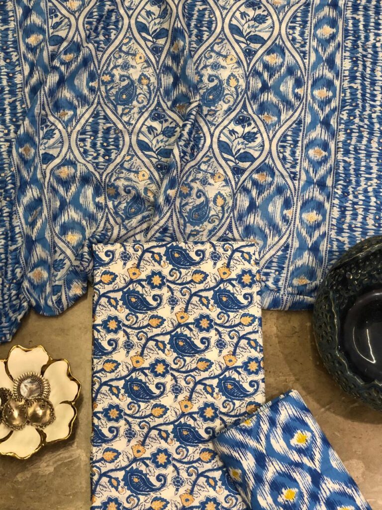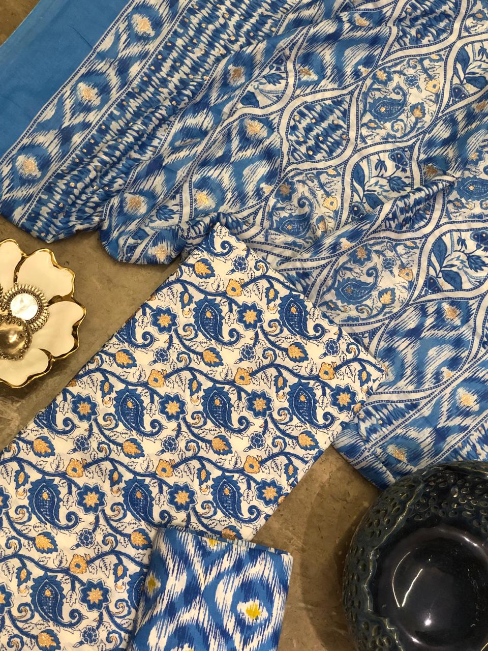 This fabric set offers the perfect balance of comfort and style. The subtle golden foil print adds richness and festive appeal, while the pure cotton base keeps the outfit breathable and easy to carry all day long. Whether you want to stitch it into a flowing kurta, a chic straight-cut suit, or a timeless anarkali, the possibilities are endless.